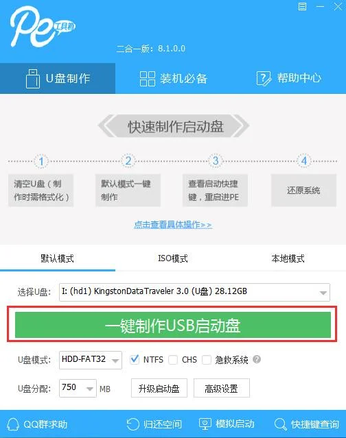 插上准备好的空白U盘后,软件会自动识别并选择当前插入的U盘。首先通过【选择U盘】下拉列表选择您将要制作的U盘,然后点击【一键制作USB启动盘】按钮开始启动U盘启动盘的制作。