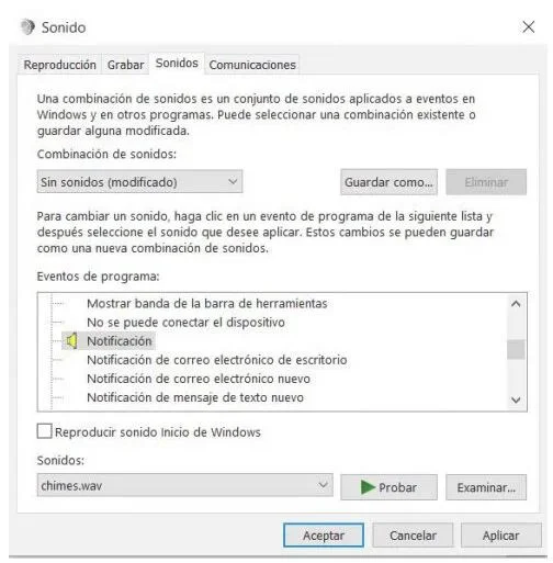 现在,肯定有一些我们想要保留的系统声音,例如windows 10中的通知。如果是这样,我们必须做的是再次回到“系统声音”窗口,查找事件 要从节目事件列表中保持激活状态的通知,一旦选中,在窗口底部,我们选择要播放的声音以进行通知。