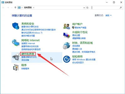 2.在打开的控制面板窗口中,点击打开“硬件和声音”设置。如下图所示