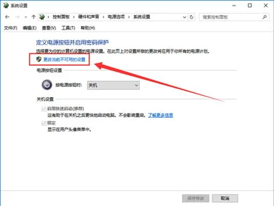 4.来到系统设置窗口,用户们会发现关机设置下面的“启用快速启动”是灰色的无法进行操作,点击“更改当前不可用的设置”按钮进入下一步操作。如下图所示
