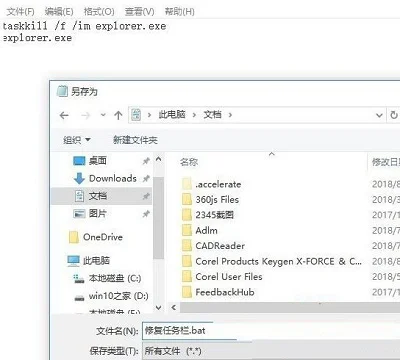 1、把下面两行保存到记事本,然后改后缀名 为 .bat 比如保存为修复任务栏.bat;