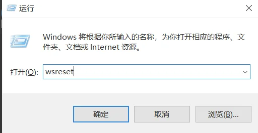 2、按住Windows键+R键,输入“wsreset”,按下回车键重置应用商店;