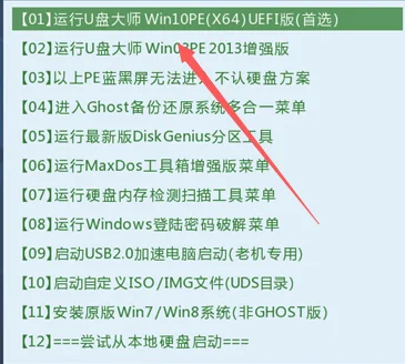 2、进入到U盘装机大师主菜单界面后,选中“【01】运行U盘大师Win10PE(X64)UEFI版(首选)”