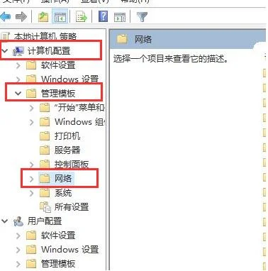 2、在左侧任务栏中选择计算机配置——管理模板——网络。