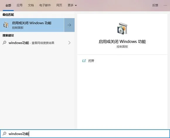 1.首先在开始菜单里输入「Windows 功能」打开「启用或关闭 Windows 功能」设置。