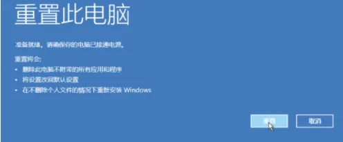 7、点击重置按钮。电脑就会自动重启并重置此电脑,耐心等待重置完成即可。