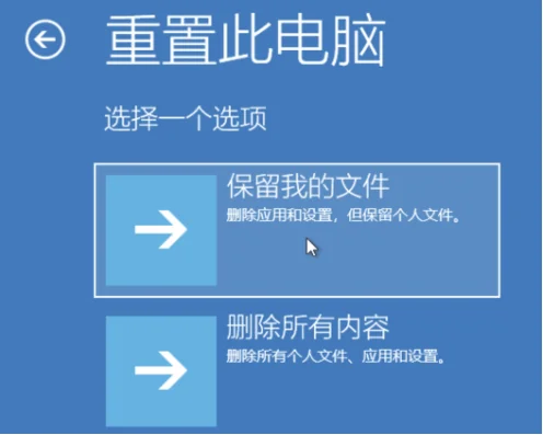 5、出现两种选择,保留我的文件和删除所有内容。大家可以根据需要进行选择。