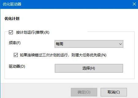 7、这时会弹出优化驱动器窗口,在这里选中“按计划运行”前的复选框,然后在频率一项设置自动优化的周期,接下来点击“选择”按钮,在窗口中选中要自动优化的盘符,最后点击确定按钮;