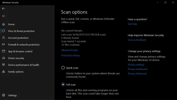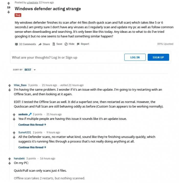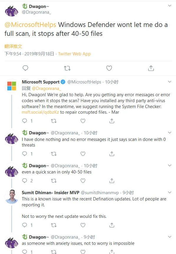根据Reddit、Feedback Hub和推特等社交平台上的用户反馈,在安装今年9月16日发布的“用于 Windows Defender Antivirus 反恶意软件平台的更新 – KB4052623(版本 4.18.1908.7)”之后,导致快速扫描和全盘扫描功能无法正常使用。如果用户尝试快速扫描和全盘扫描,只会扫描少量文件之后在不到1分钟的时间内结束。