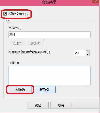 4、打勾“共享此文件夹”,在单击“权限”。如图所示:
