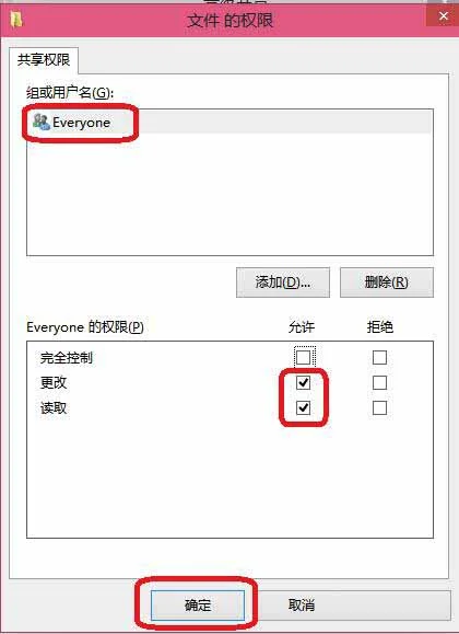 5、这里选择“更改”权限,在单击确定。这样就完成了共享文件夹。如图所示: