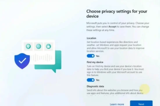 看到这个画面时,我们把这些选项开关全部关掉,点击Next,然后稍等一会,windows11的欢迎画面就出来了,至此win7升级Windows11就已经完成了。