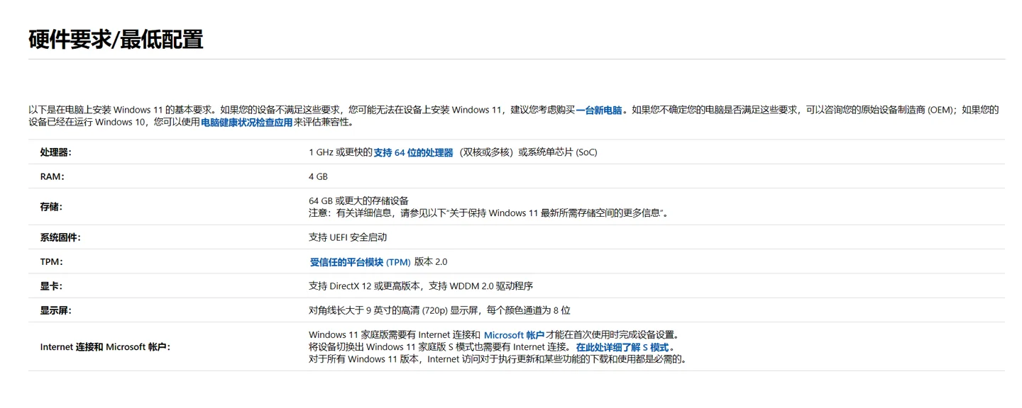 需要 1 GHz 或更快的支持 64 位的处理器(双核或多核)或系统单芯片 (SoC);4 GB 内存;64 GB 或更大的存储设备;支持 UEFI 安全启动;受信任的平台模块 (TPM) 版本 2.0;支持 DirectX 12 或更高版本,支持 WDDM 2.0 驱动程序;对角线长大于 9 英寸的高清 (720p) 显示屏,每个颜色通道为 8 位。