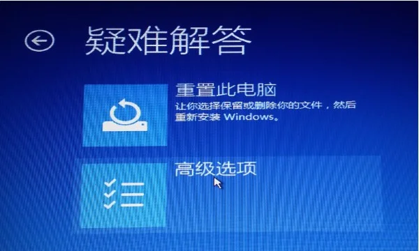 1、 电脑重启进入选项页面,选择进入“疑难解答”,找到“重置此电脑”。