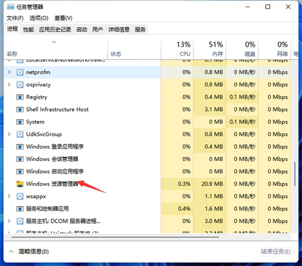 2、选中“Windows资源管理器”进程,点击右下角的“重新启动”即可重启Windows资源管理器,你会发现桌面图标和任务栏会短暂的消失然后又重新显示,这就是Windows资源管理器进程explorer.exe结束后又重新开启的过程。