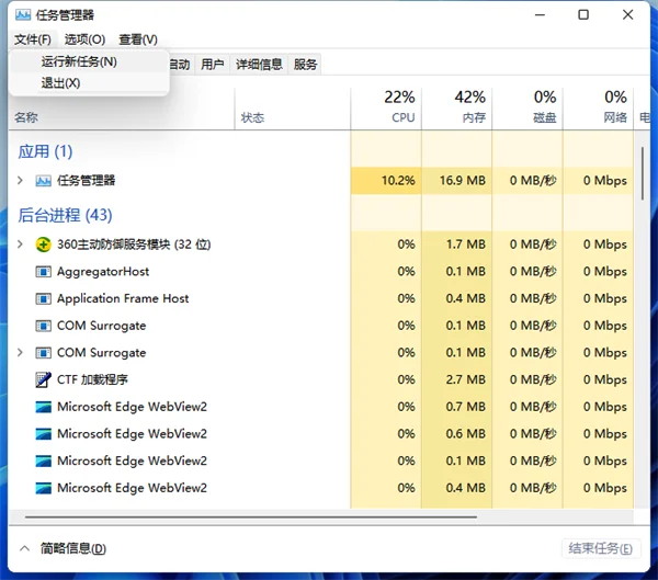 3、按“Ctrl+Shift+Esc”组合快捷键打开“任务管理器”窗口,点击“文件”菜单,选择“运行新任务”。