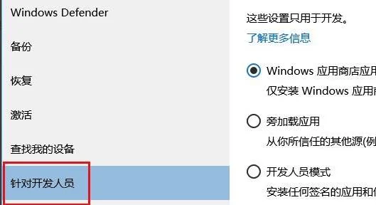 3、进入“更新与安全”窗口之后点击下方的“针对开发人员”。