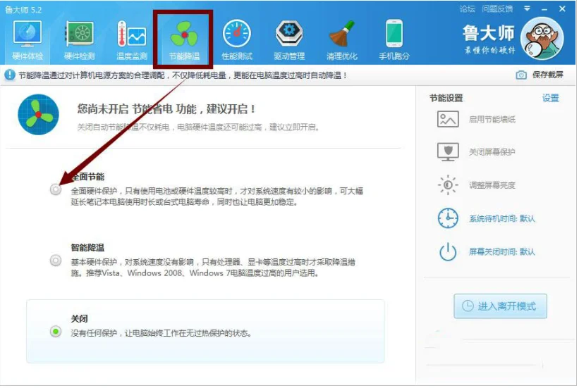 3、点击上方的“节能降温”点击全面节能,这样就有效的监控电脑硬件的温度,如下图所示;