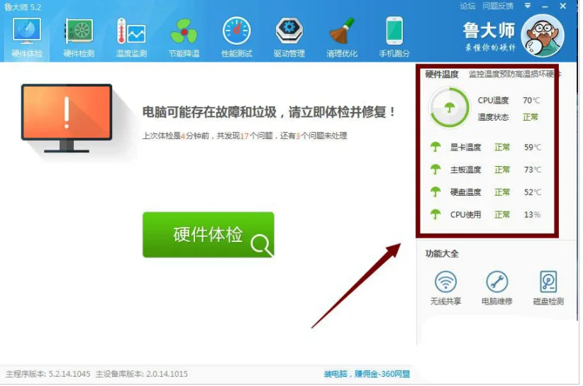 1、打开鲁大师,右侧就可以看到各项硬件的温度,如下图所示;