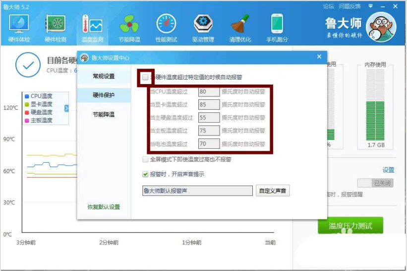 2、点击上方的“温度监测”-“设置”,即可设置好温度达到超过多少摄氏度自动报警,这样就有效的监控电脑硬件的温度,如下图所示;