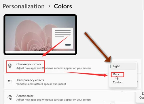 不少朋友都知道Win11系统可以设置白色背景主题和黑色背景主题,一般来说都是使用白色背景,但是也有朋友喜欢黑色背景,具体应该如何设置呢?电脑知识网小编下面来教大家设置Win11主题颜色,希望对你有帮助。 Win11主题颜色设置的设置方法 1、点击桌面的开始菜单,找到并打开Settings设置按钮。 2、在页面左侧点击Personalization个性化按钮,单机打开Colors颜色选项卡。 3、在选择颜色栏目中点击更改Dark选项,并保存设置即可开启黑暗模式。