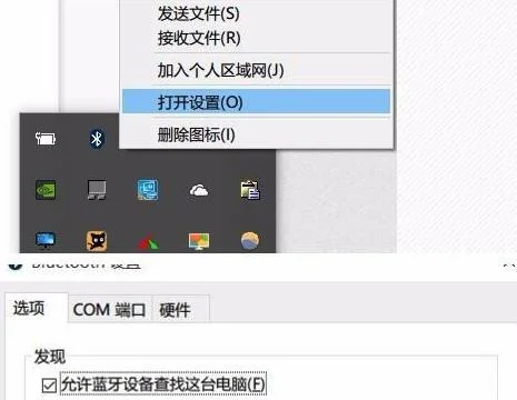 1、首先右击屏幕右下方区域的蓝牙图标,在弹出的对话框中选“允许蓝牙设备查找这台电脑”。