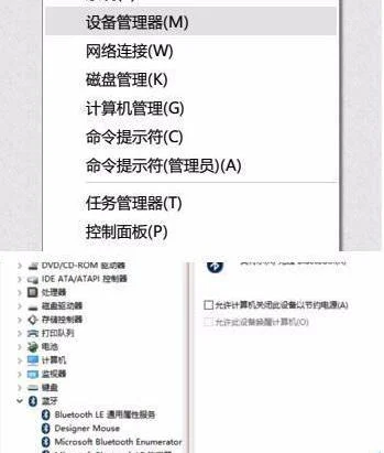 2、随后右击屏幕左下角的Win进入“设备管理器”,双击蓝牙图标来展开子目录,打开每一个子项,如果新出现的对话框中有“电源管理”的选项,就选“允许计算机关闭此设备以节约电源”击确定。