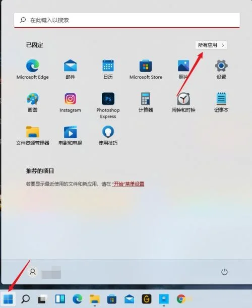 1、点击底部任务栏的开始菜单图标,点击【所有应用】。