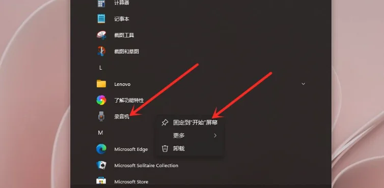 进入应用列表中,右键点击”应用“,在弹出的菜单中点击【固定到”开始“屏幕】,即可将应用快捷方式添加到开始菜单。