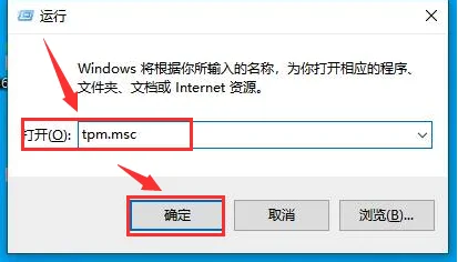 2、在打开选项中输入tpm.msc内容,点击确定跳转。