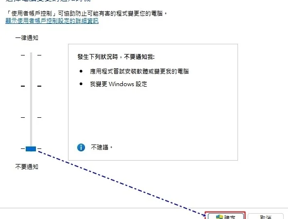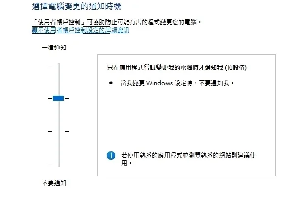 出现下图视窗,看到有采四个等级的通知调整,主要是依应用程序尝试变更电脑或改变Windows设定时的状况而分的,一律通知是不管怎样,只要有风吹草动即立刻通知。预设值是只有应用程序尝试变更电脑通知,但改变Windows设定不通知。