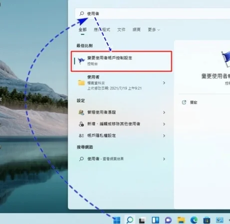 1、在Windows 11开始菜单的搜索框中输入「变更使用者帐户控制设定」只输入“使用者”或“UAC”也一样,即可找到点击打开。