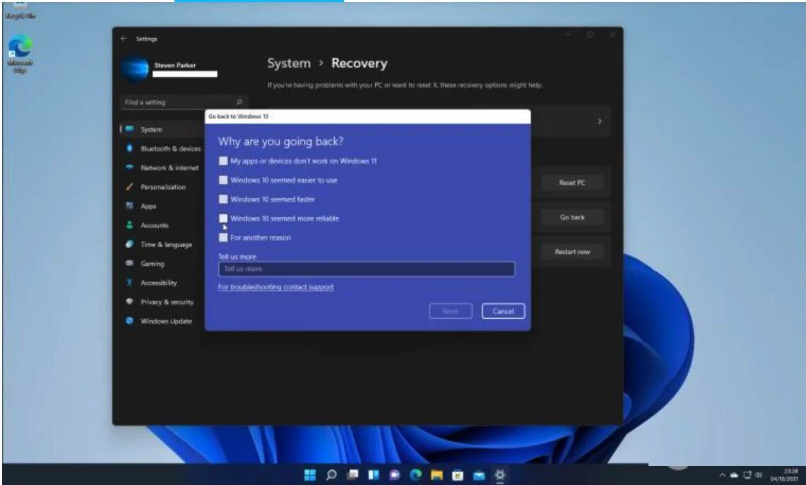 您可以选择提供返回的理由。如果你想告诉微软为什么,老实说,否则您可以勾选任何内容,然后单击Next。