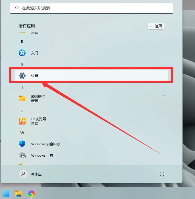 1、在桌面中找到开始菜单栏目下的设置按钮。