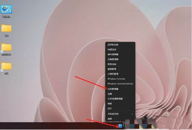1、鼠标右键单击任务栏中的【开始】选项,然后在弹出的菜单中选中【任务管理器】,打开任务管理器。