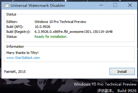 下载Universal Watermark Disabler工具,运行后会显示出当前系统的版本以及水印状态,「Status」中显示「Ready for installation」即已经可以去除水印了,点击「Install」按钮,稍等片刻它就会帮你去除版本号水印了。