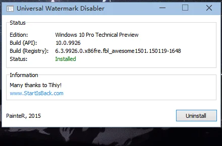 Universal Watermark Disabler 完成操作后会提醒你即将进行注销工作,所以你最好是保存手头上的工作和进程。注销后再次运行 Universal Watermark Disabler 就会显示已经安装了的状态,如果想要恢复水印的话点击「Uninstall」按钮就可以了。