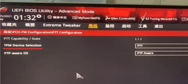 5、华硕主板intel平台开启TPM,按入F7进入高级模式后,依次点击高级–PCH-FW ConfigurationPTT Configuration选项,将TPM Device Selection选项改为PPT代表开启TPM,