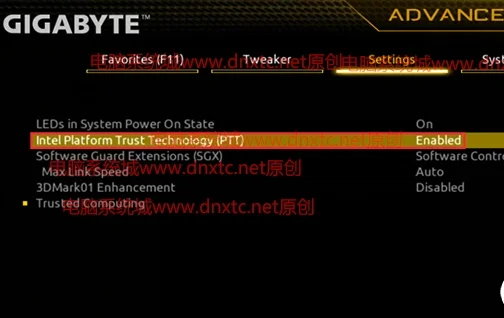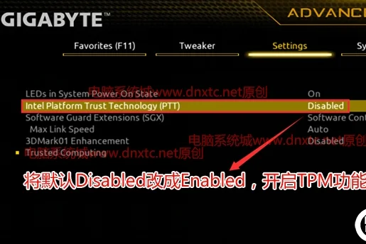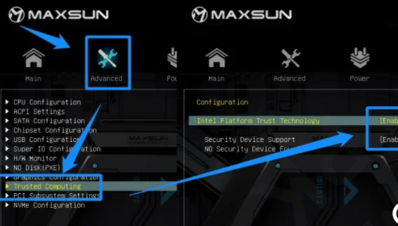 6、铭瑄主板intel平台开启TPM:依次点击Advanced–Trusted Computing选项,将intel Platform Trust Technology默认disabled改成enabled,表示开启TPM,