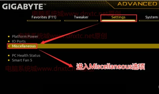 1、重启电脑连续按[DEL]键进入BIOS设置,如下图所示;切换到Settings选项,进入Miscellaneous,如下图所示;