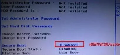 2、在security选项卡里的“secure boot”进行更改为“Enabled”即可。