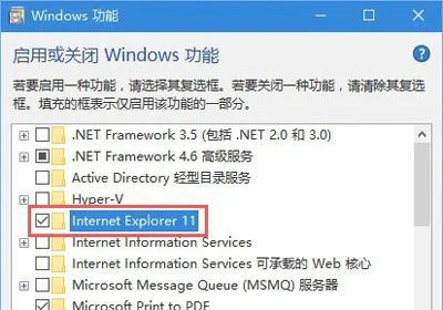 4、将internet explorer 11前面的对勾点击取消,点确定后,系统会卸载掉internet explorer 11,重启电脑后,再进入启用或关闭windows功能,选择internet explorer 11前面的对勾出现后,点确定,系统会重新安装internet explorer 11,如下图: