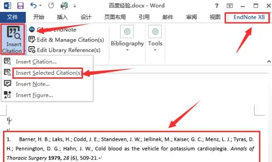 5、之后插入之前的文字内容,打开word目录“EndNote-Insert Citation-Insert Selected Citation”即可。