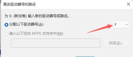4、点击下拉菜单,选择想要修改的驱动器号(驱动器号不能重复),最后点击确定;