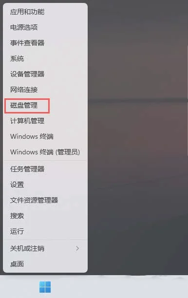 1、首先,按键盘上的 Win + X 组合键,或右键点击任务栏底部的Windows开始图标,在打开的隐藏菜单项中,选择磁盘管理;