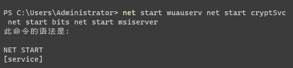 4、最后只需要重启更新服务即可,输入“net start wuauserv net start cryptSvc net start bits net start msiserver”回车确定。