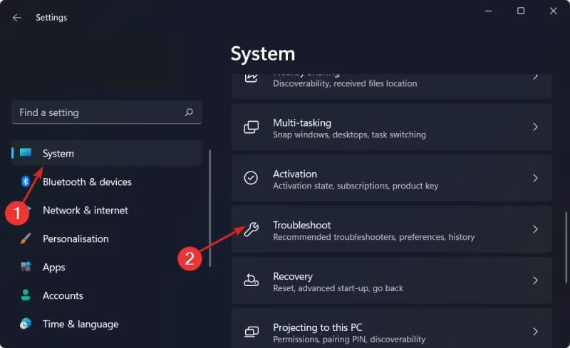 1、按住windows键 +并从左侧面板i导航到系统,然后是疑难解答。