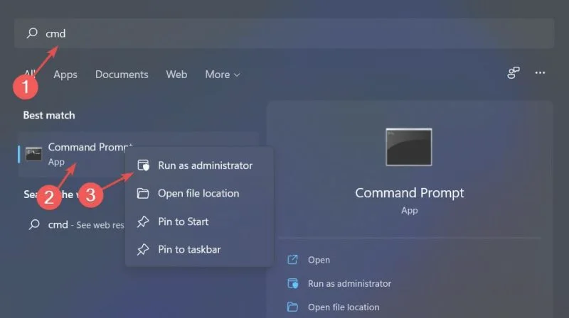 1、通过在windows搜索功能中键入cmd并右键单击它,以管理员身份打开命令提示符。