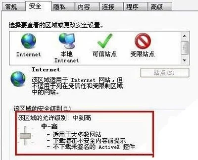 3、如果还是存在问题,就重新打开Internet选项,在切换到安全选卡,把级别调到低,或者是中等,在点击确定保存设置;