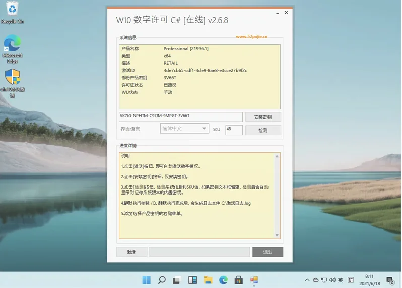 以上密钥均为安装系统时的版本选择使用不具备激活功能,若要想要激活则需要使用KMS GVLK或零售类的密钥。